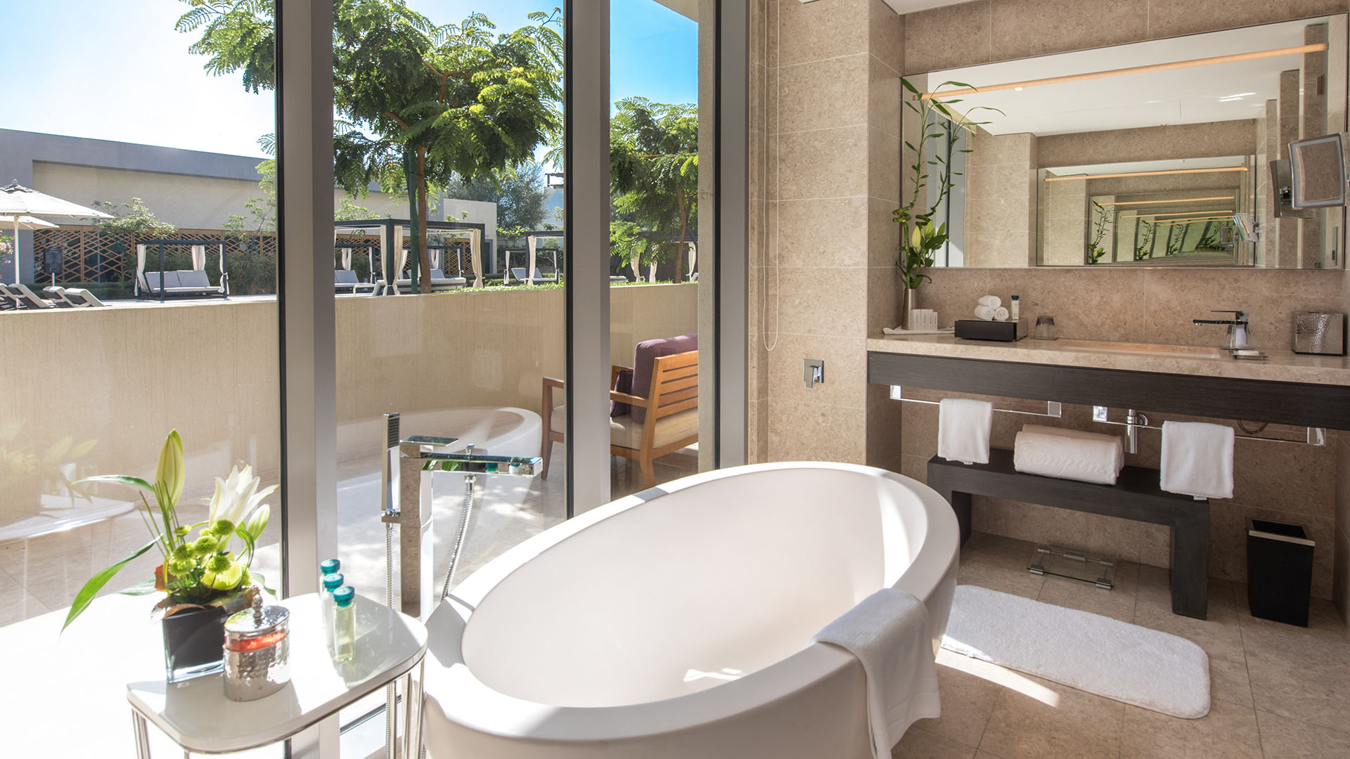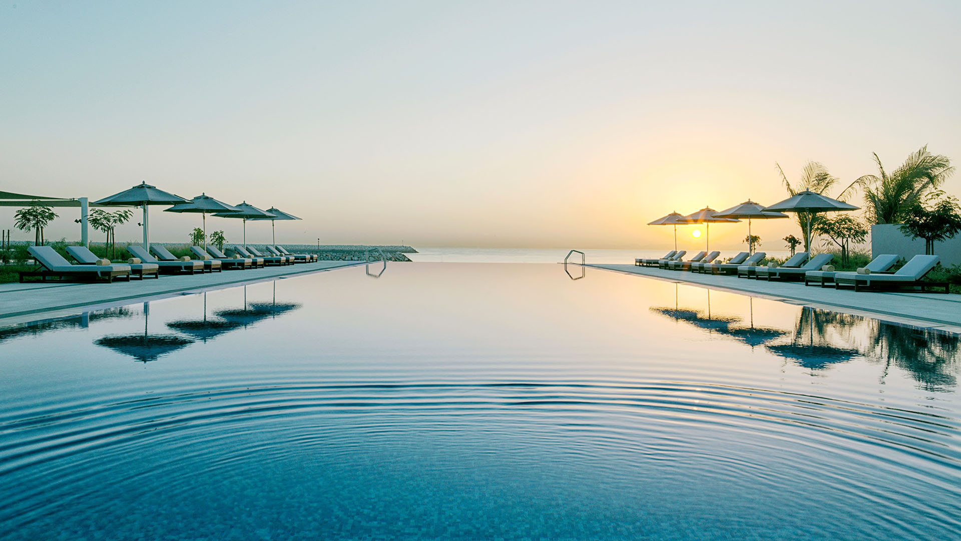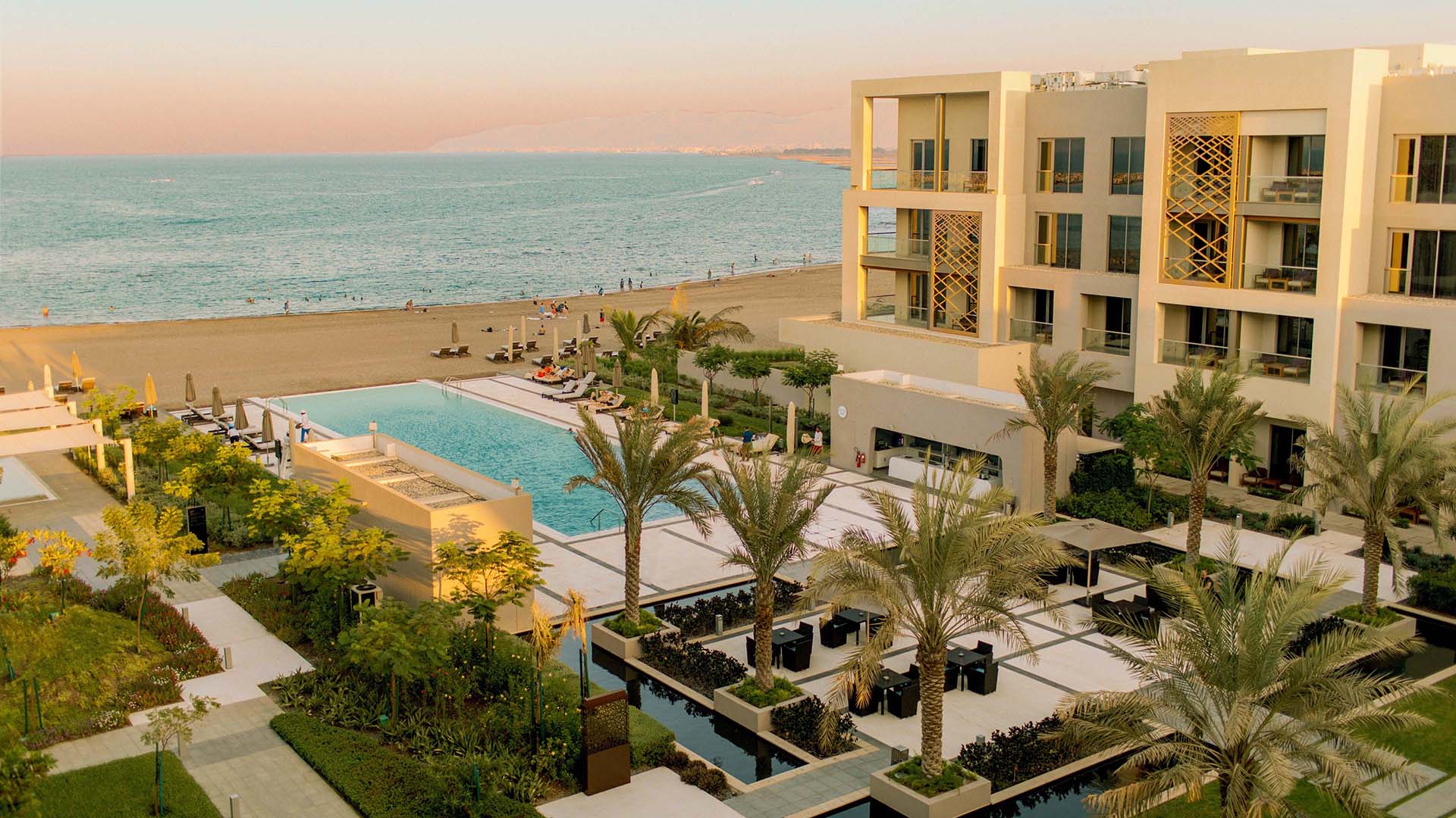 Die weitläufigen Gemeinschaftsbereiche des Resorts kombinieren zeitgenössisches Design mit omanischen Einflüssen und sind von üppigen Gärten umgeben, die eine Oase der Ruhe erzeugen. Panoramaterrassen gewähren spektakuläre Ausblicke auf das Arabische Meer, während zwei beeindruckende Pools, darunter ein Infinity-Pool mit direktem Blick auf den Ozean, den perfekten Ort zur Entspannung in einer paradiesischen Umgebung bieten. Ergänzt wird dieses luxuriöse Angebot durch den privaten Sandstrand mit feinem, weißem Sand und kristallklarem Wasser, der Gästen ein exklusives Erlebnis ermöglicht.