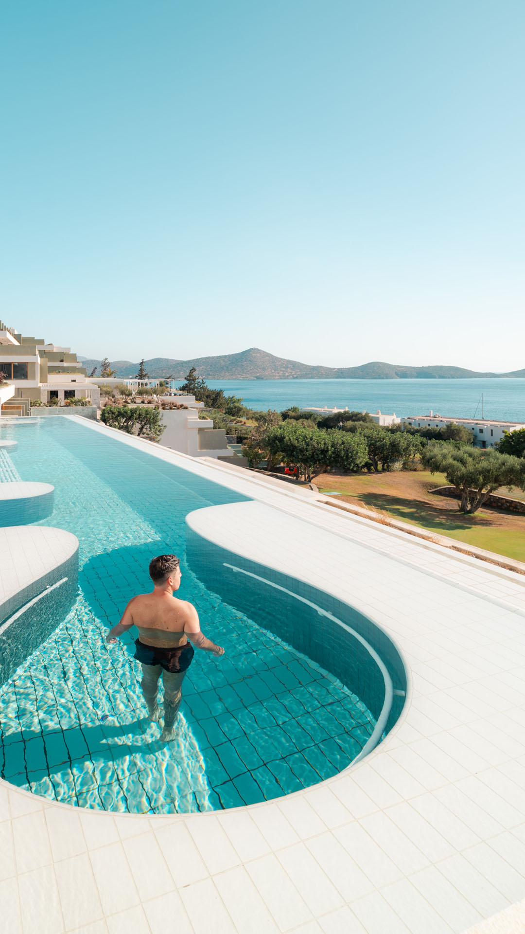 Das Porto Elounda Golf & Spa Resort erstreckt sich auf einem terrassenförmig angelegten Hügel inmitten von Wäldern und Natur und bietet mehrere Unterkunftsmöglichkeiten, die alle einen Blick auf das Ägäische Meer in einer einzigartigen und privaten Umgebung bieten. Die umweltfreundlichen, niedrigen Gebäude sind von den Fairways der 9 Löcher umgeben. Die Anlage verfügt über einen eigenen Privatstrand und einen 420 Quadratmeter großen, beheizten Außenpool direkt am Meer. Dieser schlängelt sich in sanften Kurven durch einheimische Bäume und Sträucher und ist mit einem Whirlpool und Sonnenliegen im flachen Wasser ausgestattet - perfekt, um jederzeit einen kühlen Kopf zu bewahren.
