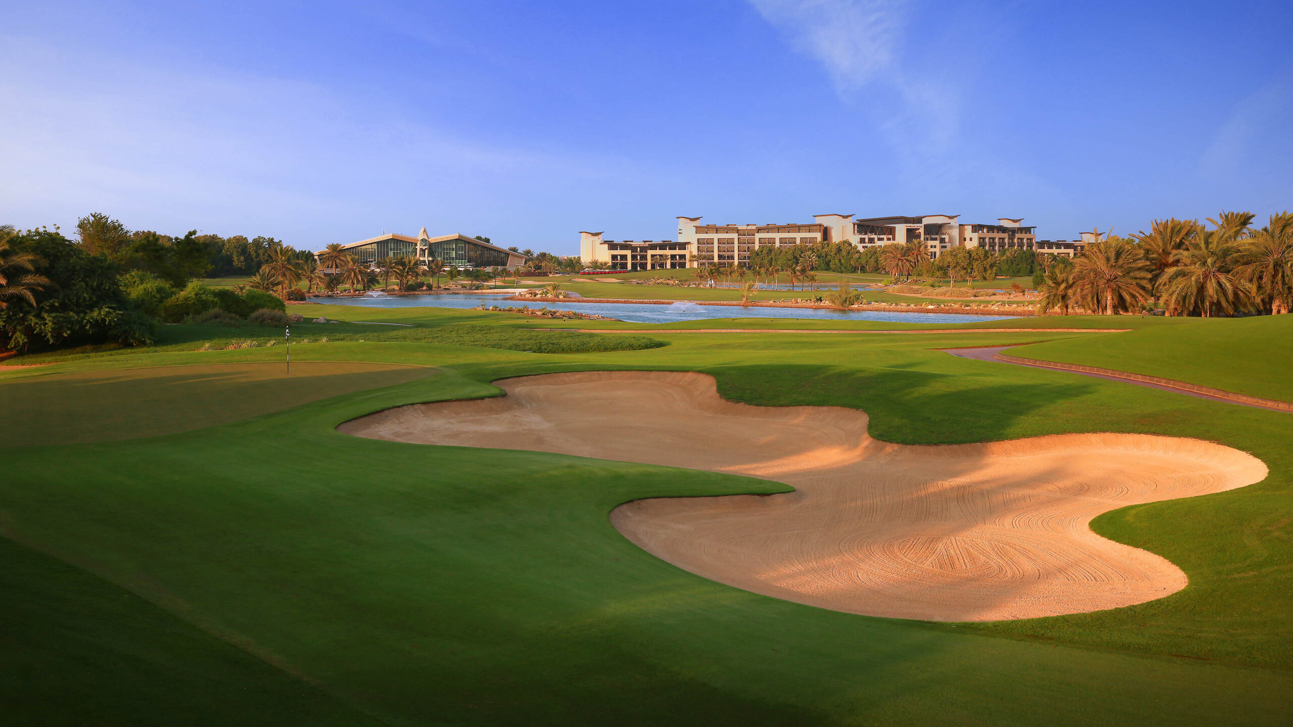 Hier anfragenDer Abu Dhabi Golf Club, in dem seit 2006 die Abu Dhabi HSBC Golf Championship der PGA European Tour ausgetragen wird, wurde wunderschön in der arabischen Wüste angelegt, wo sich seine sanft gewellten Fairways zwischen Palmen, Zierbäumen und nicht weniger als 7 trügerischen Seen schlängeln.